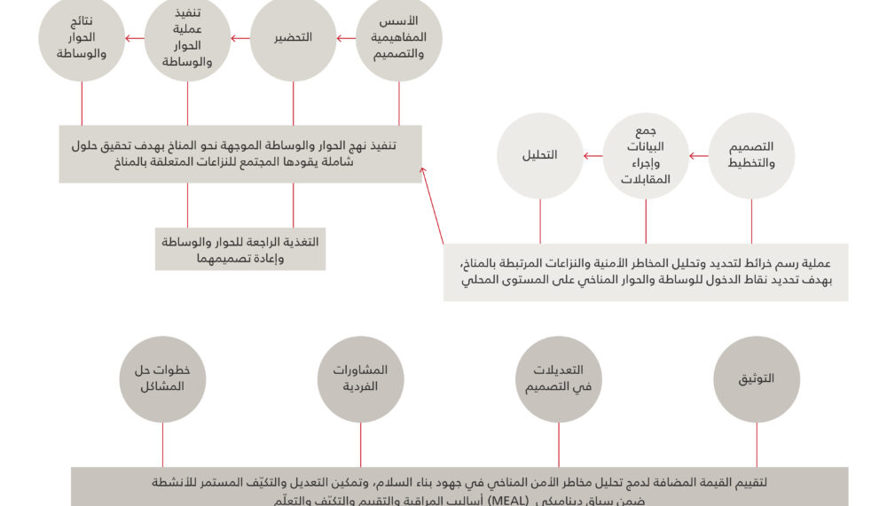 ويقدّم الرسم المدرج أدناه مخططًا مبسطًا للخطوات الرئيسية التي نقترحها في مجموعة الأدوات هذه لمعالجة النزاعات والوقاية منها، وذلك من خلال دمج القضايا المناخية والبيئة في عمليات الحوار والوساطة التي تقودها المجتمعات المحلية: