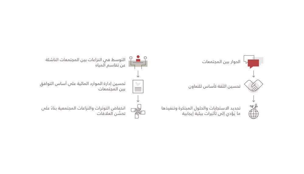 ركّزت الخطوة الأولى في عملية الحوار على تحسين العلاقات بين القرى المعنيّة. ومن خلال اللقاءات الأوّلية، تمّت استعادة الثقة بين المجتمعات المحلية من دون التركيز على إيجاد حلول. فقد ساهمت الجلسات في تغيير السلوك، إذ بدأ المخالفون للقانون يُلاحظون أثر أفعالهم على غيرهم ممن يعيشون بعيدًا عن مصدر المياه. ومن خلال تشجيع هؤلاء المشاركين على التعاطف مع الآخرين، نجح الوسيط/الميسّر في كسب موافقتهم على استمرار العملية.