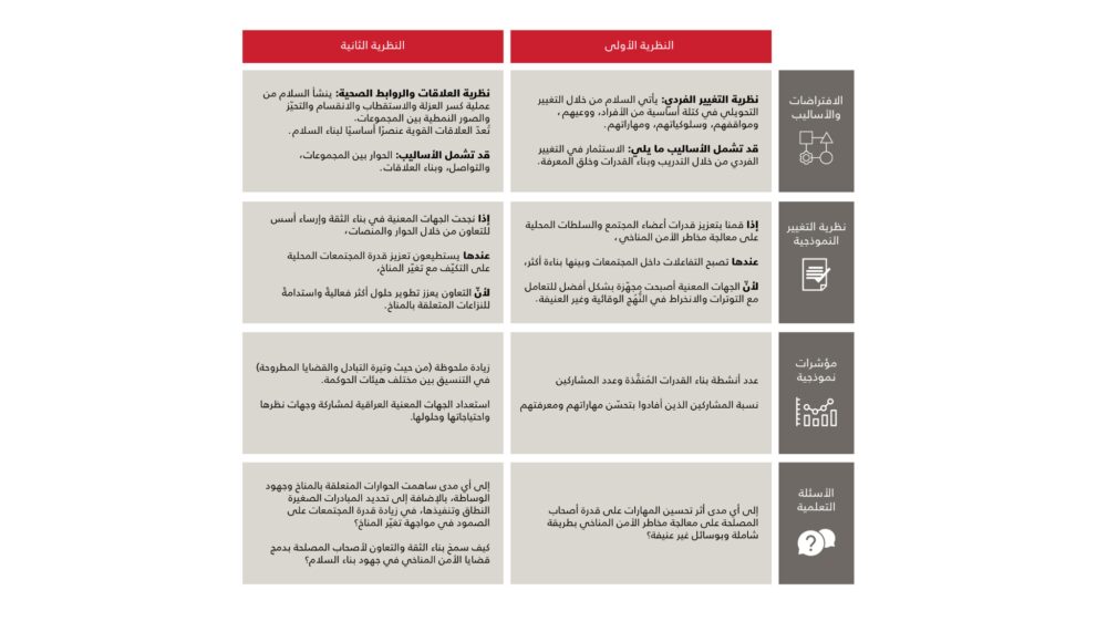 تصف نظرية التغيير كيف يهدف المشروع إلى إحداث التغيير، مما يوفر إطارًا لفهم كيفية تحقيق هذا التفاعل للنتائج المرجوة، مثل الحد من النزاعات وتحسين القدرة على الصمود: "نظرية التغيير هي شرح لكيف ولماذا يُتوقَّع أن يُحدِث إجراء معيّن أهدافه المنشودة، أي التغييرات التي يأمل في إحداثها من خلال أنشطته، مما يكشف عن الافتراضات الأساسية". يُعد ربط نظرية التغيير بالمؤشرات مفيدًا عند التخطيط لتقييم الأثر. ويمكن أن تكون أسئلة التعلم داعمة في توجيه التقييم وتحديد التعديلات اللازمة على نظرية التغيير ومنطق المشروع.